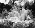 Image shows a frozen broken pipe. The frozen pipe is off of Scenic Dr., one block north of Marigold, spray from the pipe froze solid in a formation about 15 feet high and 25 feet wide, loading nearby trees with icicles. Published in the Fort Worth Star-Telegram morning edition, January 31, 1951.