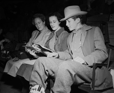 Mrs. Ray Taylor, left, whose daughter, Patricia, was Decatur Day cowgirl sweetheart, looks over the rodeo program with her son, Gordon, and Miss Raynette Stone.