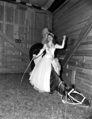 Image shows Miss Huguette Ann Bonneville, auburn-haired Parisienne, riding her dancing horse, Glamor Doc in stable. She is wearing a dress. She performs rodeo acts at the Southwestern Exposition and Fat Stock Show.