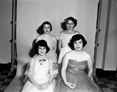 Image shows four Stripling Junior High School students in dresses for the Valentines formal dance. The four students will be hostesses at the James Leito Studio. Front left to right, Toni Fairley, daughter of Mr. and Mrs. Dave Fairley, 4821 Harley; and Marriane Miller, daughter of Mr. and Mrs. Glen A. Egan, 1419 Thomas Pl. Back left to right, Linda Lee, daughter of Mr. and Mrs. Willis Lee, 1317 Virginia Pl. and Gay Floyd, daughter of Mr. and Mrs. B. T. Floyd, 1300 Belle Pl. The parents will be chaperons at the dance. Published in the Fort Worth Star-Telegram morning edition, February 9, 1951.