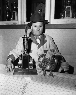 This White Laced Red Cornish pullet, entered by Blanton Hancock, Future Farmers of America boy from Leonard, was judge champion bird of the junior chicken division at the Stock Show. With it is Judge John Wunderlich of St. Louis. The trophy, which bears the words " Texas State Branch, American Poultry association, Champion Junior Bird". Published in Fort Worth Star-Telegram morning edition February 1, 1951.
