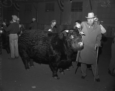 C. M. Caraway of DeLeon is shown here with his reserve champion Shorthorn bull of the Stock Show, Prince Peter Mason. Published in Fort Worth Star-Telegram morning edition February 1, 1951.