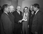 Participating in the annual meeting of the Texas Swine Breeders' Association here were, from left to right, Reid Stewart of Peoria, Illinois; R. L. Pemberton, national secretary of the Hampshire registry, Peoria; Bill Reneker, head hog buyer for Swift & Company, Chicago; Fred Hale, professor of husbandry at Texas A&M, College Station; T. J. Harrell, a director of the breeders' association, and W. S. Walker of Burleson, president of the association.