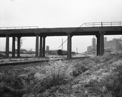 Overpass; Railroad tracks; Railroad trains; Factories