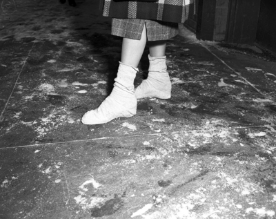 Image shows an unidentified person wearing a pair of white shoes used during a snowstorm. Published in the Fort Worth Star-Telegram evening edition, January 31, 1951.