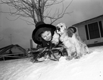Image shows Judith Ann Reding, 8 and her Cocker Spaniel dog, Honey, hugging and playing on a snow sled in snow outside their home, 1709 Brooks Hollow, River Oaks. Judith Ann Reding is used to the snow from the two years they stayed with her father in the Air Force, Captain Edgar J. Reding in Newfoundland. Published in the Fort Worth Star-Telegram morning edition, February 3, 1951.