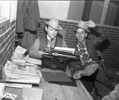 Bud Sherman, WBAP radio and TV rodeo expert, gets a boot out of one of Oliver Knight's essays. The other boot (in foreground) is one of a pair just purchased by Knight, who didn't want to look like a greenhorn.