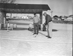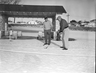 Just to see what it's like to golf in the snow, visiting Professional Ray Garrett, left, of Wichita Falls Country Club, and Bill Wright, golf equipment salesman of Fort Worth, tee off at Rockwood. They gave up after one hole score untold. Published in Fort Worth Star-Telegram morning edition, February 3, 1951.