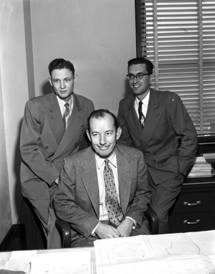 Image shows three members of the Pure Oil Company's exploration department. The three members were added to its Texas division: seated, C. Win Payne, division geophysicist, president of the Permian Basin Geophysical Society, transfer from Midland. Standing left to right, J. Lee Davis, geophysicist, Big Spring, and Gregory L. Turner, geologist from Tyler. Published in the Fort Worth Star-Telegram morning edition, February 4, 1951.