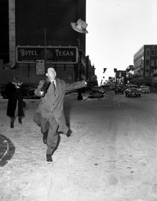 Image shows Rayford Payne, 3700 Sandgate, Fort Worth National Bank teller, chasing after his hat after the wind blew his hat away at 7th and Main. Unidentified woman shown to the left of Rayford Payne. Published in the Fort Worth Star-Telegram evening edition, February 1, 1951.