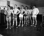 Image shows five Central Young Men's Christian Association (YMCA) weightlifters lifting weights in preparation for Region 2 Southwest Area weight-lifting championship. From left to right, Bob Galloway, Ted Reigle, Jimmy Gill, Johny Dunton, and Coach Bill Derrick. Published in the Fort Worth Star-Telegram evening edition, February 2, 1951.