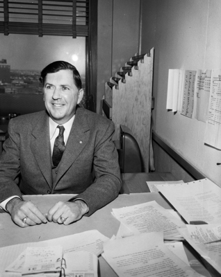 Image shows a bust shot of Morris S. Denman, industrial mobilizer. He is shown seated in an office. Published in the Fort Worth Star-Telegram morning edition, February 2, 1951.