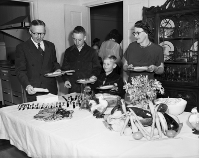 Shown standing in line at a nine family buffet dinner, are, left to right, Mr. Elliott J. Roberts, his sons, Robert, 16, and Tommy, 8, and Mrs. Roberts. Published in the morning edition, February 11, 1951.