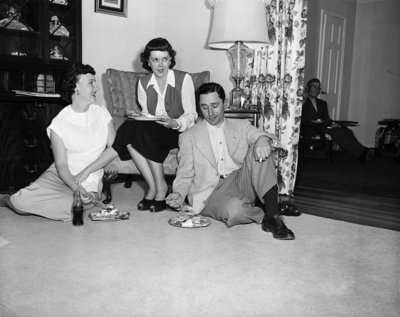 Image taken during the neighborhood get-together held for the families that lived in the 3500 block on Westcliff Road South. This image shows three of the events guest eating. Left to right, are Mrs. Raymond Sealey, shown sitting on the floor; Mrs. Clarence White, shown on a chair; and Frank Quattrochi, the host, also sitting on the floor. An unidentified man can be seen sitting off to the right in the background. Published in the morning edition, February 11, 1951.