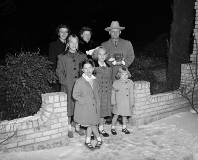 Image taken during the neighborhood get-together held for the families that lived in the 3500 block on Westcliff Road South. This image shows several guests arriving to the dinner. In the back, left to right, are, Mrs. A. C. Petersen, Mrs. A. Nielsen, and Mr. Nielsen; front, left to right, Gail Petersen, Diane Quattrochi, then Jill and Laurel Petersen. Published in the morning edition, February 11, 1951.
