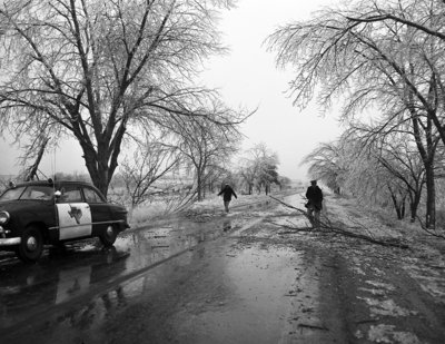 State highway Patrolmen clearing broken tree limbs from stretch of highway between Rhome and Boyd.