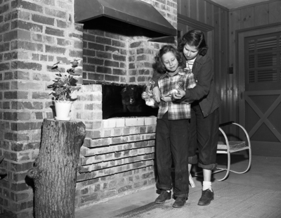 In this picture Mr. and Mrs. Stout's daughters, Ann, 11, and Susan, 7, are shown at the gridiron preparing to roast marshmallows.