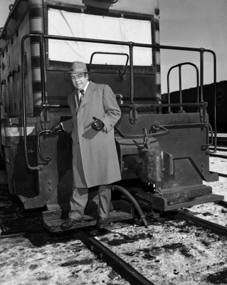 Image shows D. C. Sheets, white collar executive for 20 years, is at the footboard of a Fort Worth & Denver City Railway Company diesel switcher engine. He is performing the job of the railroad's switchmen. Sheets is an agent for the Burlington Refrigerator Express Company and is directing switches for refrigerator cars containing perishable foods. Published in the Fort Worth Star-Telegram evening edition, February 2, 1951.