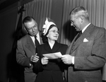 Image shows center, Mrs. Cora Jones, 533 W. Bluff, Ralston-Purina Mills Private Branch Exchange (PBX) operator is receiving a check from Donald Danforth, right, St. Louis, company president, for submitting accepted suggestion to benefit the local plant. R. E. Cowan, left manager, is looking on with hand on the shoulder of Cora Jones. The presentation was made at the employee's banquet at Black Stone Hotel. Published in the Fort Worth Star-Telegram evening edition, February 2, 1951.