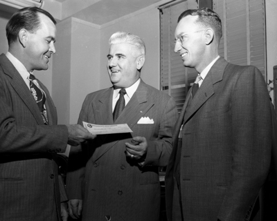 Image shows Stewart Hellman, center, Tarrant County chairman of the March of Dimes, receiving a check for $11,086.91 from A. G. Owen, left and Joe B. Ellis, right, co-chairman of the polio fund drive sponsored at the Convair plant here by the Convair Management Club. Published in the Fort Worth Star-Telegram morning edition, February 4, 1951.