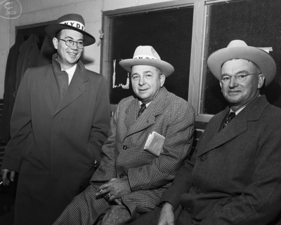 Among the delegation in Fort Worth for Sydner Day at the Southwestern Exposition and Fat Stock Show were, left to right, James Rosser, president of the Snyder Chamber of Commerce; C. T. McLaughlin, rancher and oil man, and Mayor Forest Sears. Published in Fort Worth Star-Telegram evening edition February 5, 1951.
