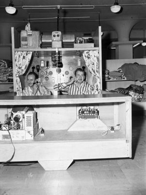 Image shows two men, Aubrey Turner, left, shaving and W. E. Baker brushing his teeth. They are in a head board of the Springs Cotton Mills' bed at Stripling's. The electric razor and tooth brush are among a dozen gadgets built into the head board. Published in the Fort Worth Star-Telegram morning edition, February 4, 1951.