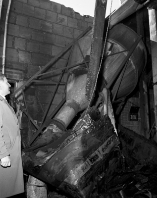 Image shows Leroy Black inspecting fire damage at the Acme Coffee Company plant. Leroy Black is co-owner of the plant. Published in the Fort Worth Star-Telegram morning edition, February 5, 1951.