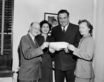 Image shows four members of the Beta Alpha Rho's 17th annual bosses banquet at Glen Garden Country Club are, left to right, Edward L. Rawlins, magician who will present; Miss Mary Davis, program chairman; J. A. Gooch, master of ceremonies and Miss Mary Makaravich, reservations chairman. They are shown holding a piece of paper. Published in the Fort Worth Star-Telegram morning edition, February 6, 1951.