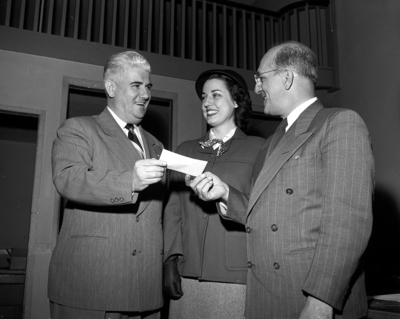 Image shows Stewart Hellman, left, chairman of the March of Dimes campaign for Tarrant County, congratulating Philip F. Perna, right and Mrs. Ruth Jameson, center. Philip F. Perna and Mrs. Ruth Jameson head the drive at the Fort Worth Quartermaster Depot, hand over check for $3,006.42 to the polio fund. Published in the Fort Worth Star-Telegram morning edition, February 7, 1951.