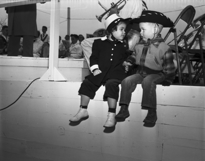 At Children's Day at the Southwestern Exposition and Fat Stock Show, Patsy Kay Leach, 4 wearing a Granbury tag on her bonnet, listens to a band concert with Weldon McCarty, 3, of Weatherford.