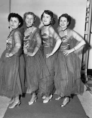 Image shows four members of The Sweethearts on Parade, performers that will participate in the variety show at Riverside Junior High School. The Sweetheart members, from left to right, Mrs. Carol Reedy, R. R. Abel, Carl Tatum, and Sam Flanary. Published in the Fort Worth Star-Telegram evening edition, February 7, 1951.