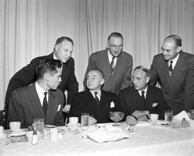 Image shows local leaders and guest speakers gather at a table before the annual Brotherhood Week banquet in Blackstone Hotel. Standing, left to right, are Fort Worth Co-chairmen of National Conference of Christians and Jews, Richard U. Simon, Bernard Lunt and Sterling Holloway. Seated, left to right, are Ross Clinchy, chapter leader, former French Premier Paul Reynaud and Dr. Everett R. Clinchy, head of the National Conference of Christians and Jews. Published in the Fort Worth Star-Telegram morning edition, February 7, 1951.
