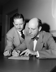 Image shows Dr. Clive R. Johnson, left, acting director of the Fort Worth Laboratory for Surgical Research, with Dr. Robert P. Glover, internationally known surgeon, right, seated writing. He will speak at Tarrant County Medical Society meeting. Published in the Fort Worth Star-Telegram evening edition, February 7, 1951.