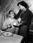 Image shows left, seated, Captain Samuel H. Yoast Jr. receiving coffee and cake from his wife, Mrs. Samuel H. Yoast Jr. , standing, right. They are shown to be at a dining table. He spent time fighting in Korea and has a broken back that will keep him in the hospital for a year. Published in the Fort Worth Star-Telegram morning edition, February 8, 1951.