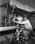 When Assistant Crowley Fire Chief Harry Teeter sounded the siren of the town's new fire truck for practice, kids came careening around all corners. He then showed them the water pump mechanism. The children, left to right, are, Patricia Ann Tummons, Elaine Burgner, and Ernest Clayton Farris, all age 8. Published in the morning edition, February 11, 1951.