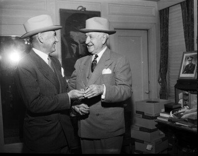 Series not published of Amon carter with officials of the Mutual Life Insurance Co. of New York. Included are Clifford B. Reeves, Stanton Hale, Lewis W. Douglas, Roger Hull and Oliver M. Whipple. Amon Carter and an unidentified man in a room. In the room is boxes, pictures and books.
