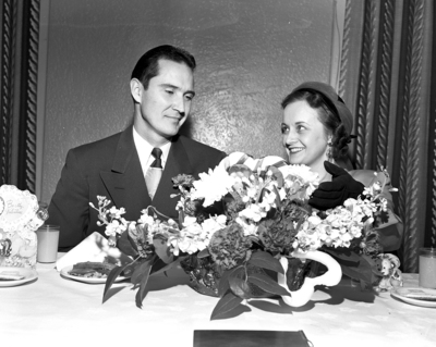 Image shows Felix Ankele, left, vice president of the Fort Worth Junior Chamber of Commerce, presenting a bouquet on behalf of the Jaycees to the Newcomers Club. Right is Mrs. W. S. Parks, 601 Hassett, a new Jaycees to the Newcomers Club. The Jaycees took over sponsorship of the Newcomers Club's meeting. They are shown to be seated at a table behind a bouquet of flowers. Published in the Fort Worth Star-Telegram evening edition, February 9, 1951.
