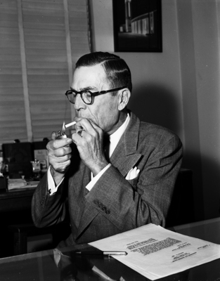 Image shows City Manager, W. O. Jones. He is shown to be seated and lighting a cigarette in an office. Published in the Fort Worth Star-Telegram morning edition, February 9, 1951.