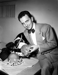 Image shows Mr. Chebeck, former Fort Worth millionaire, unpacking hats for the opening of Vogue Fashions, 700 Houston. He will be a manager and buyer at the ready-to-wear specialty shop. Published in the Fort Worth Star-Telegram morning edition, February 11, 1951.