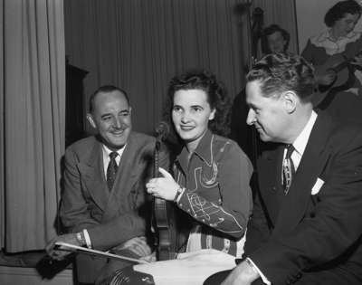 John D. Moynahan of New York and Chicago, left, and James A. Rutherford of Newark, New Jersey, right, are shown talking to Miss Billye Gale, center, one of the "Rhythemettes", an all-girl string band. The photo was taken at an underwriters banquet. Published in the morning edition, February 9, 1951.