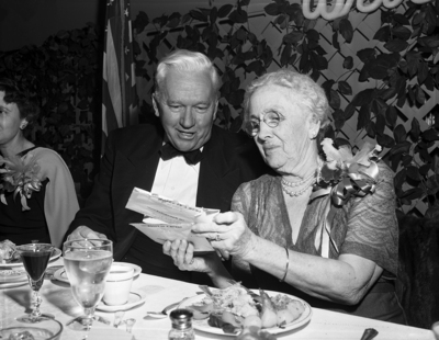 Image shows Wright Morrow, Houston, left and Mrs. John M. Hanna, Dallas. They are shown to be seated at table at Mineral Wells annual Party of the Year. Mrs. Hanna is showing Morrow letters. Published in the Fort Worth Star-Telegram morning edition, February 11, 1951.