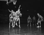 Austin Community College's Oscar Dorsey (jersey no. 9) finds the going rough as Texas Wesleyan College's Lou Tassione (jersey no. 70) and another teammate with arm extended above Dorsey's head, reduce the Wildcat's chances at a basket. Harold Thomas (jersey no.12) in the background. Published in Fort Worth Star-Telegram morning edition February 10, 1951.