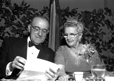 Image shows Dr. M. E. Sadler, left and Mrs. Rupert Harkrider. They are shown seated at a banquet table at the Mineral Wells Annual Party of the Year. Dr. M. E. Sadler is holding a piece of paper. Published in the Fort Worth Star-Telegram morning edition, February 11, 1951.