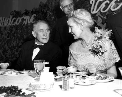 Image shows Vice President Alvin Barkley, left, talking with Dr. May Owen, Fort Worth at the Mineral Wells "party of the year". Dr. Owen was honored and Barkley was the speaker for the event. They are talking at a banquet table. Published in the Fort Worth Star-Telegram morning edition, February 10, 1951.