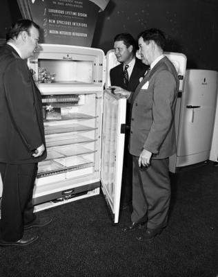 Image shows A. W. (Jack) Lynch, right, district manager for Servel Incorporated, pointing out the extra freezing and storage spaces provided in the new 1951 double door refrigerators to C. K. S. Russom, left, Russom Gas Appliances, Fort Worth Servel wholesale distributor and Zack P. Russom Jr, right at a dealer's meeting. They are shown inspecting a double door refrigerator model. Published in the Fort Worth Star-Telegram morning edition, February 10, 1951.