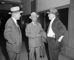 Image shows Ray Harris, center, brother of murdered Nelson Harris, in conference with his attorney, right, Ross Hardin, before appearing at a special night grand jury session. Unidentified man on left of Ray Harris. They are shown standing in building chatting. Published in the Fort Worth Star-Telegram morning edition, February 10, 1951.