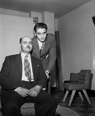 Image shows Saleh N. Abu'Igal, seated, former Jordanian postmaster in Jerusalem. He is shown with his son, Victor Abu'Igal, standing, student at the Bible Baptist Seminary. Published in the Fort Worth Star-Telegram morning edition, February 11, 1951.