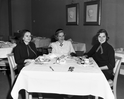 Image is from a series on the Junior League. The image shows Several new members of the league seated at a table chatting. From left to right, are, Mrs. W. A. Schmid Jr.; Mrs. James M. Harison, and Mrs. W. C. Bahan. Published in the morning edition, February 18, 1951.