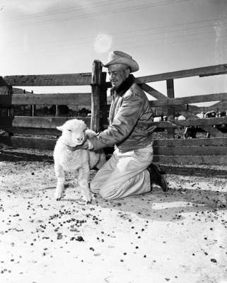 Image shows March cover of Ranch & Farm shows. Leo Richardson is shown with lamb in pen. Published in the Fort Worth Star-Telegram March 1951.