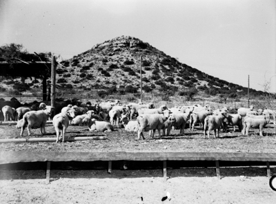 Image shows Leo Richardson's show flock of sheep. The sheep are shown to be in a ranch pen next to a mountain. The mountain is across from Highway 51 from Richardson Ranch headquarters near Iraan. Published in the Fort Worth Star-Telegram March 1951.